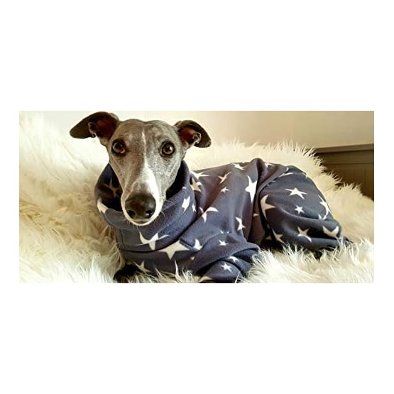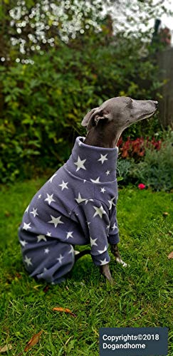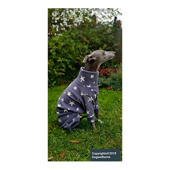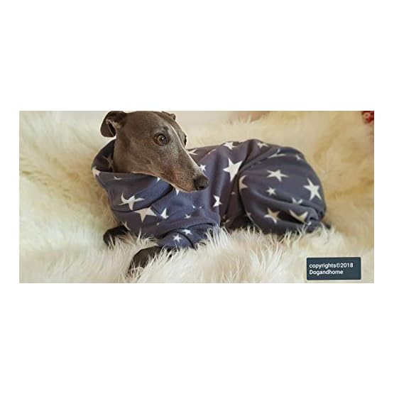 Greyhound, whippet fleece pajamas in lovely grey with white stars pattern.Fabric is very good anti-pill stretchy fleece which is durable and easy to wear and wash in 30 Celsius. XXS 18”-20” PET BIGGER THAN ITALIAN GREYHOUND BUT SMALLER THAN SMALL WHIPPET UNDER 10kg for sure, XS 20”-22” SMALLER WHIPPET CA 10kg, S 22”-24” BIGGER WHIPPET CA 14kg, M 24”-26″ DOG BIGGER THAN GOOD WHIPPET SIZE, L 26”-28”VERY VERY SMALL UNUSUAL SMALL TINY GREYHOUND! XL 28″-30″, XXL 30”-32” over 30kg