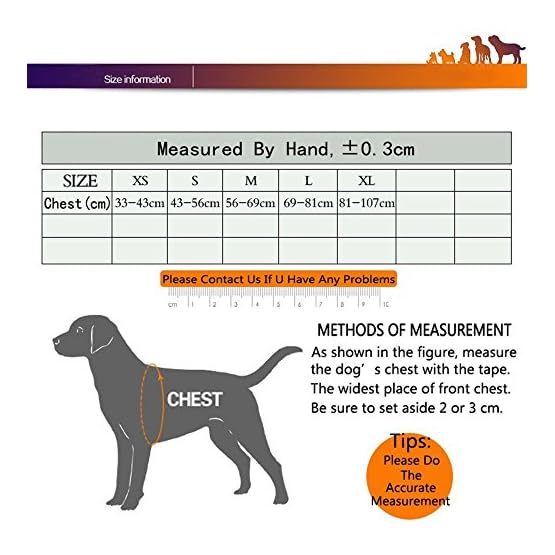 Measure your pooch’s chest with a tape, at whatever point gives the widest circumference of front chest. Be sure to set aside 0.7-1.1 inches(2-3cm). Size X-SMALL: 13-17 inches(33-43cm);SMALL: 17-22 inches(43-56cm); MEDIUM: 22-27 inches(56-69cm); LARGE: 27-32 inches(69-81cm); X-LARGE: 32-42 inches(81-107cm).