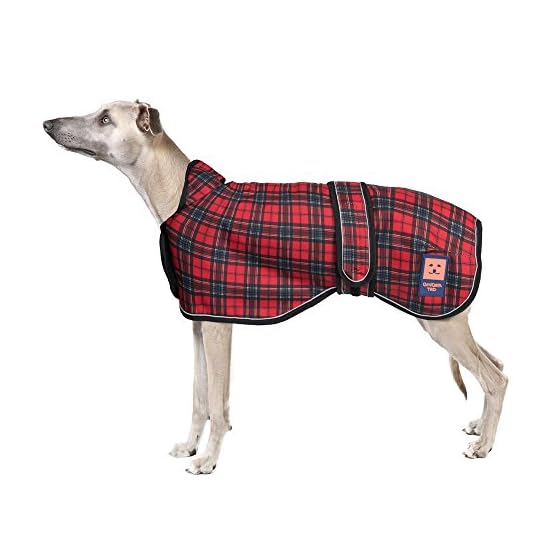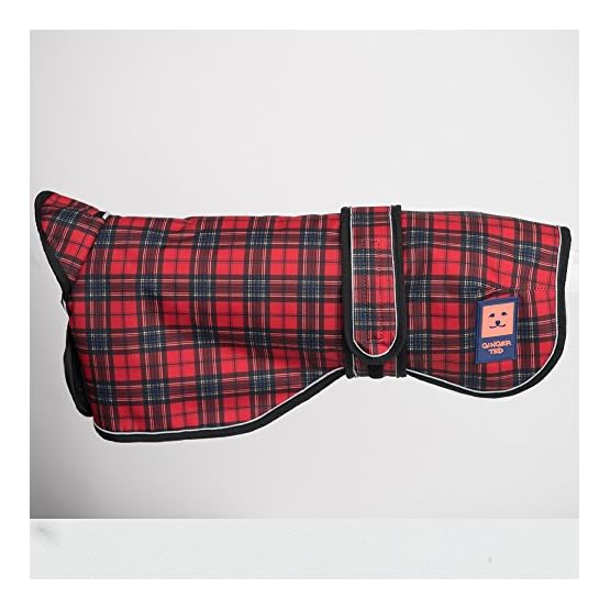 Ginger Ted Waterproof Greyhound Whippet Lurcher Dog Coat – size 28″/71cm Red Tartan – for sighthounds & narrow build dogs, warm fleecy lining, reflective piping, jacket raincoat style