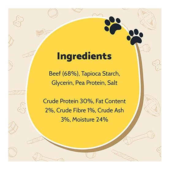 Beef (68%), Tapioca Starch, Glycerin, Pea Protein, Salt, Fat Content 2%, Crude Ash 3%, Crude Protein 30%, Crude Fibres 1%, Moisture 24%