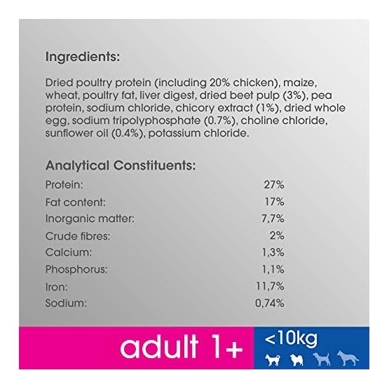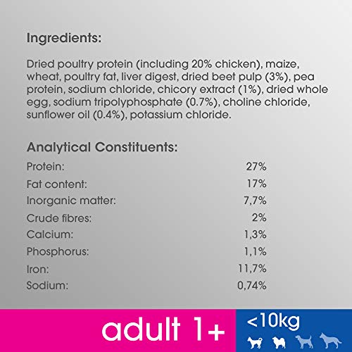 Dried Poultry Protein (including 20% Chicken),Maize,Wheat,Poultry Fat,Liver Digest,Dried Beet Pulp (3%),Pea Protein,Sodium Chloride,Chicory Extract (1%),Dried Whole Egg,Sodium Tripolyphosphate (0.7%),Choline Chloride,Sunflower Oil (0.4%),Potassium Chloride