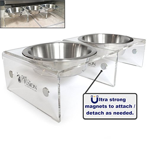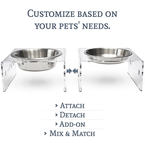 Tired of traditional feeders that only have two bowls, or needing to buy 1,2,3, or more non-elevated bowls that are messy and don’t meet your needs. The single pod feeders solve these problems allowing you to connect multiple feeders together in even or odd numbers. Flexible design lets you adapt over time, connect or disconnect. In either event, your pet will have the separate eating space it needs and deserves. Elevated design aids in healthier digestion and improved comfort leaving your pet happier and more content after their meal! Modern solution made from premium lucite acrylic (including stainless steel bowls) fits your style. Anti-slip feet to keep in place and rubber insets to help stabilize bowl by minimizing spinning and clanging. Easy to clean and maintain