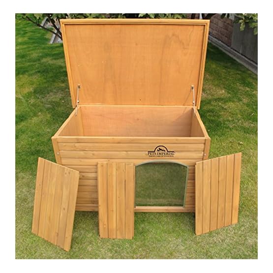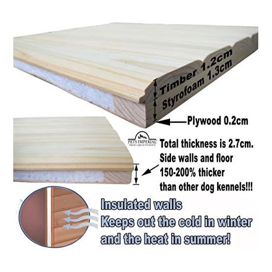 Insulation on the front and all side panels (2 sides and back). Insulation consists of timber (tongue and groove) 1.2cm thick, then 1.3cm of Styrofoam, then 0.2cm of plywood board. Keeps your dog warm in winter and cool in summer. Walls 150% thicker than other kennels.